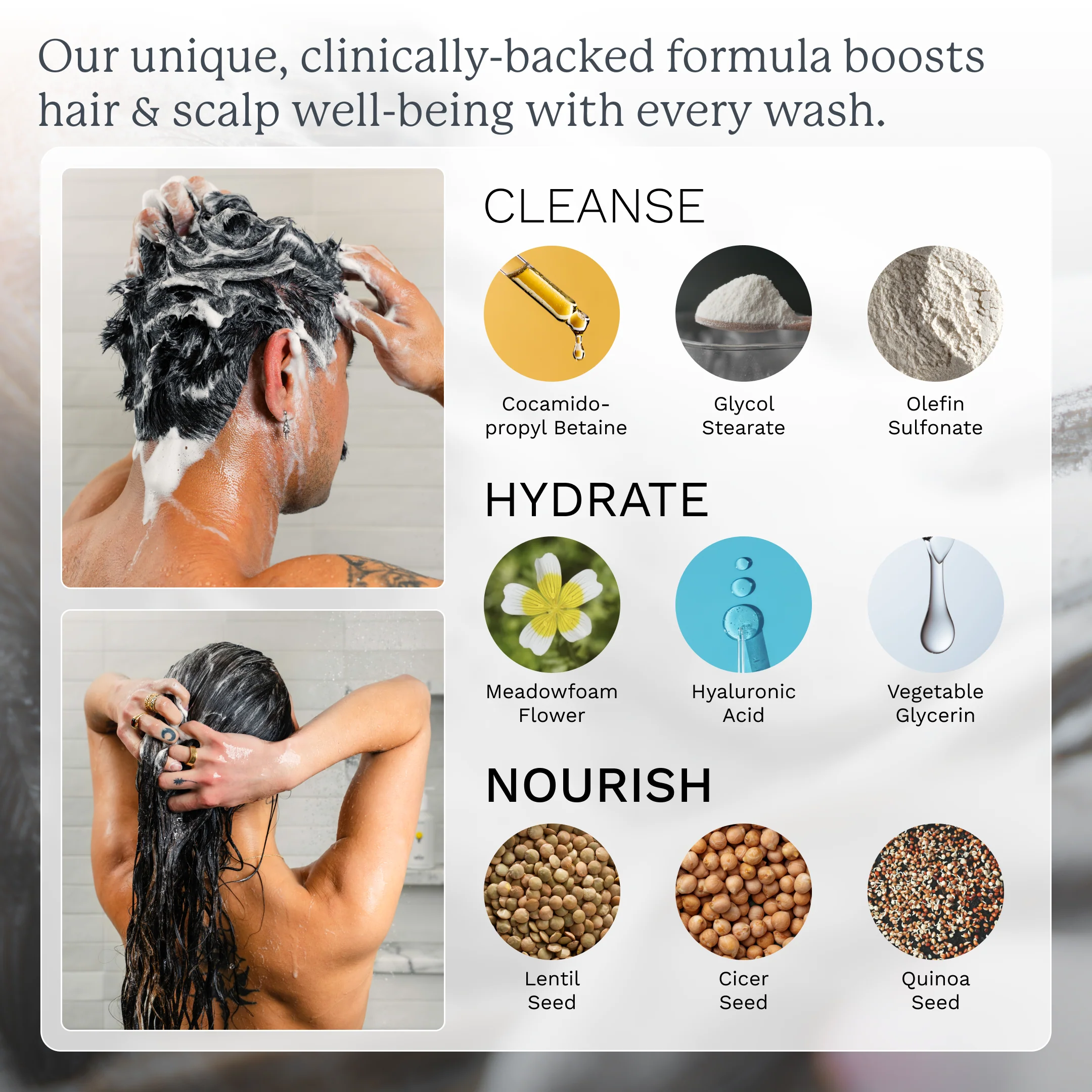 In contrast to harsh, traditional shampoos, we meticulously engineered this pH balanced, versatile cleanser with clinically backed botanicals and proteins to encourage healthy growth and deeply hydrate, detoxify, and enrich your hair.